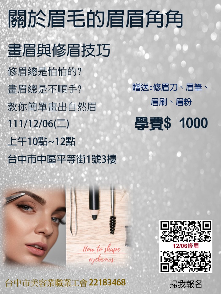 修眉總是怕怕的? 畫眉總是不順手? 教你簡單畫出自然眉 時間:111/12/06(二)上午10點~12點 地點:美容工會3樓教室 費用:1000元 贈送:修眉刀、眉筆、眉刷、眉粉 點我報名:https://forms.gle/EczUK56EeVmZusMn9